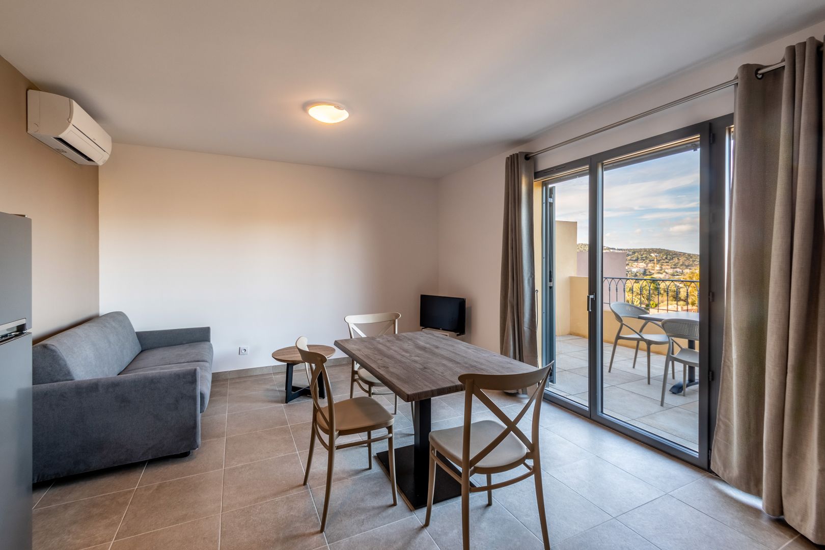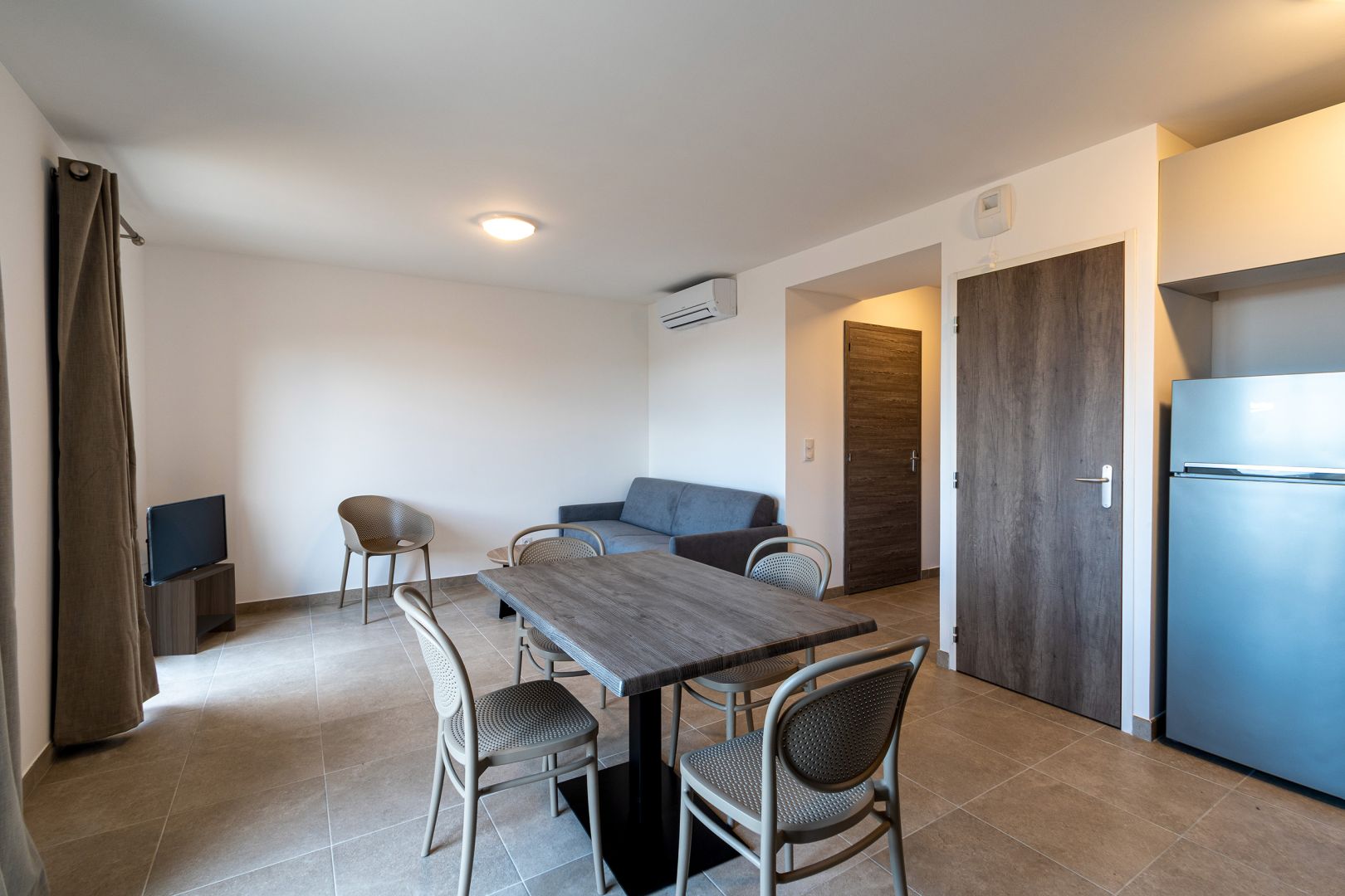 Le séjour dispose d’une télévision, d’une table et de chaises, ainsi qu’un canapé convertible permettant d’accueillir un enfant. Pour prendre vos repas ou votre petit-déjeuner à l’extérieur, tous les appartements disposent d’une terrasse de 15 m² équipée d’une table, de chaises et d’un fauteuil. Les appartements sont tous climatisés et bénéficient d’un accès Internet Wifi haut débit gratuit.