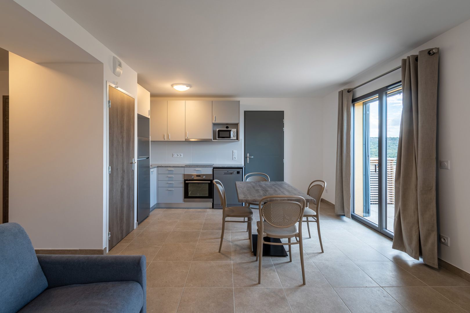 De style contemporains, les appartements à louer à l'Ile Rousse sont composés d’un séjour avec cuisine équipée et d’une ou deux chambres selon le type. La cuisine est entièrement équipée : Nécessaire de cuisine ; plaques de cuisson électriques ; four électrique encastré ; réfrigérateur-congélateur ; four à micro-ondes ; hôte aspirante ; lave-vaisselle ; machine à café ; grille-pain…